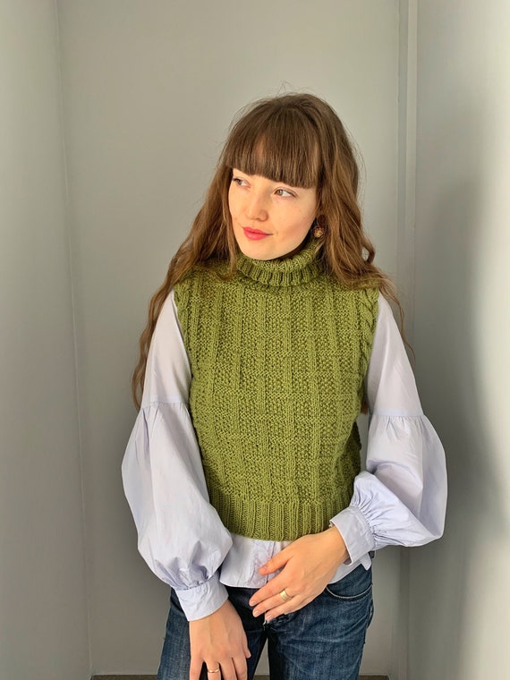 Suéter de lana manga corta mujer, suéter de lana sin mangas, chaleco suéter vintage, suéter de lana tejido a mano personalizado, cuello alto sin mangas Etsy España